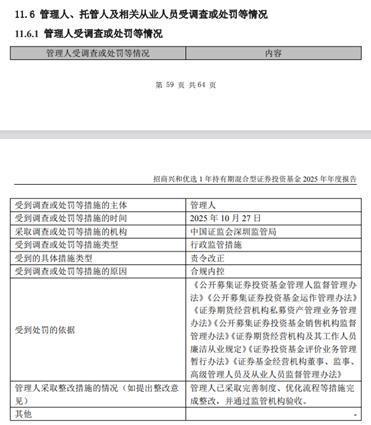 2025年,招商基金也因合规内控问题被处罚。公告显示,2025年10月27日,中国证监会深圳监管局因合规内控对招商基金采取行政监管措施,要求公司责令改正。招商基金高管因合规内控问题被监管谈话。