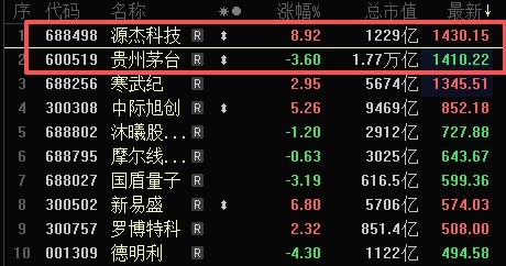 2024年9月24日至今,贵州茅台累计涨幅近20%,源杰科技累计涨幅近1500%。